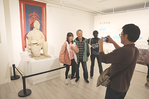 ◎ 十二月二十日,由台灣中華翰維文化推廣協會與陝西省文物交流協會、陝西省文物交流中心、秦始皇帝陵博物院等合辦的「大秦雄風.秦文化創意體驗活動」在台北市客家文化中心開幕。展覽介紹兵馬俑與秦始皇帝陵的最新考古、文物保護成果,展出用3D打印技術製造的秦俑、秦文物等,另設多款互動遊戲。圖為台灣民眾與3D打印技術製造的秦俑合影。(中新社記者 劉大煒 攝)