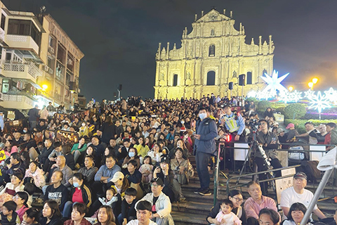 昨日是平安夜,天主教澳門教區及本澳各基督教會都有舉行慶祝活動,從教堂到街頭,盡現歡樂氛圍。其中議事亭前地「心連心報佳音」下午彩排時已吸引眾多市民和旅客圍觀,並予期待。晚上大三巴牌坊耶穌會廣場有持續四小時的平安夜綜藝晚會,節目豐富令人目不暇給。多場子夜彌撒教友積極參與,非教友也尊重禮儀觀禮,座無虛席。有參加者表示,中西文化交融在澳門是真正的融入生活,這是一場非常美好的體驗,令人回味之時,更多思考和擁抱主題「當生命遇上愛」。