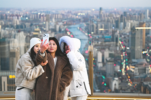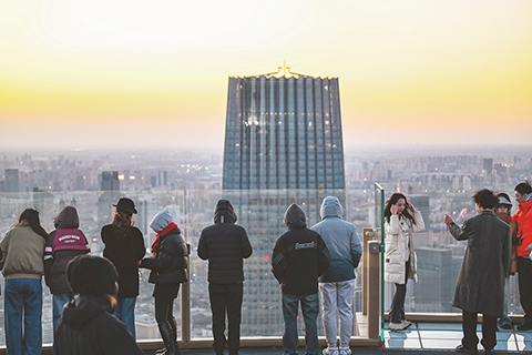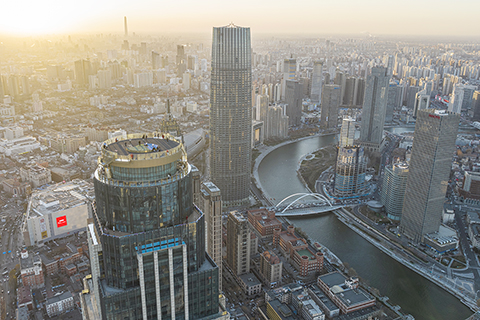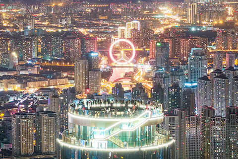 近日,位於天津市和平區津灣廣場核心位置的津灣雲頂高空觀景台開始運營。遊客可以登上三百米高的樓頂,俯瞰天津中心城區。