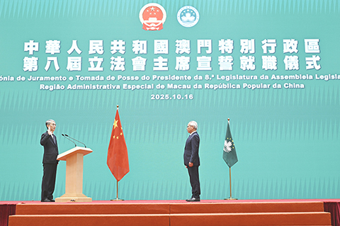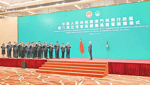 同日,行政長官岑浩輝上午和下午先後主持了澳門特別行政區第八屆立法會全體議員,以及立法會主席張永春的宣誓就職儀式。