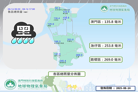今年八月十四日,本澳氣象局發出今年第二次黑色暴雨警告,是有紀錄以來生效時間最長的黑色暴雨警告,持續生效近4小時。氹仔區成澤國,其中最高水位為菜園路站0.92米。有店舖水浸員工忙於清理外,多處都有車輛因水浸被困,黑雨期間消防治安警接報29宗求助,包括有人被困車內、山泥傾瀉、外牆剝落等。