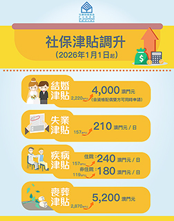 社會保障制度作為居民全生命周期的基本保障,出於對居民在面臨重要人生節點的關懷,以及在面對突發狀況時的支援,自二0二六年一月一日起調升四項津貼的金額。調升後,結婚津貼由原來二千二百二十元(澳門元,下同)調升至四千元,合資格配偶雙方可同時申請,失業津貼調升至二百一十元/日、疾病津貼方面,住院津貼調升至二百四十元/日,非住院津貼調升至一百八十元/日、喪葬津貼調升至五千二百元。