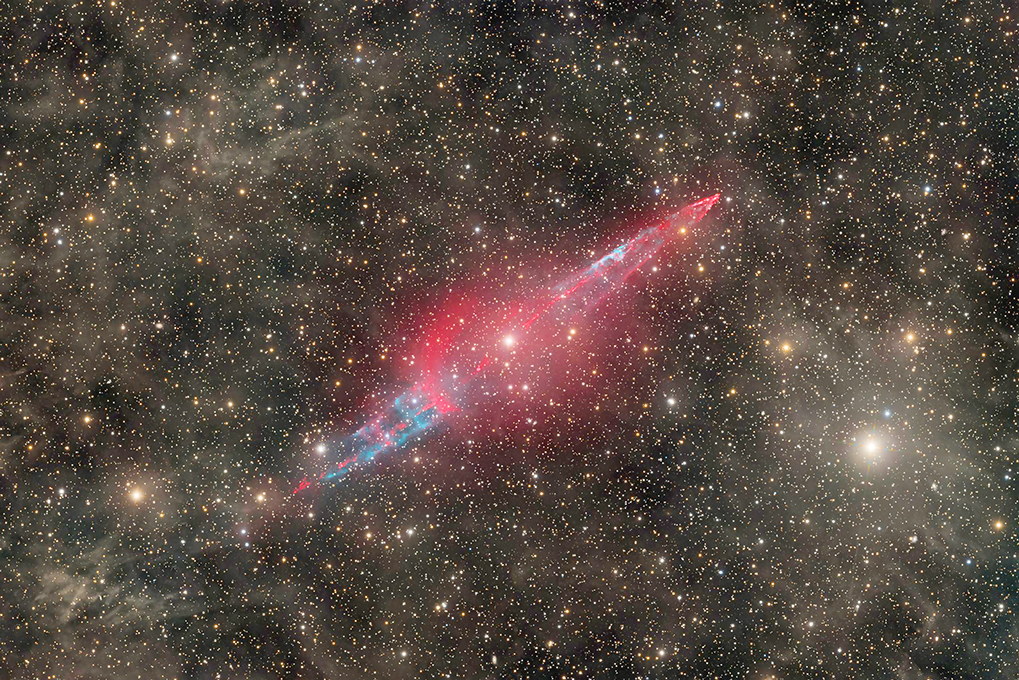 事實上,光譜學研究顯示,KX And是一個交互作用的雙星系統,由一顆明亮熾熱的B型星和一顆膨脹的低溫巨星所組成,這顆低溫巨星是B型星的共軌近距離伴星。來自冷巨星的恆星物質很可能透過吸積盤轉移到熾熱的B型星上,形成壯觀的對稱噴流,並垂直於吸積盤本身向外噴發。已知KX And的距離(二千五百光年)、噴流的視張角大小以及吸積盤的估計傾角,可以估算出每個噴流的大小達到驚人的十九光年。(影像提供&版權: Tim Schaeffer and the Deep Sky Collective)◇
