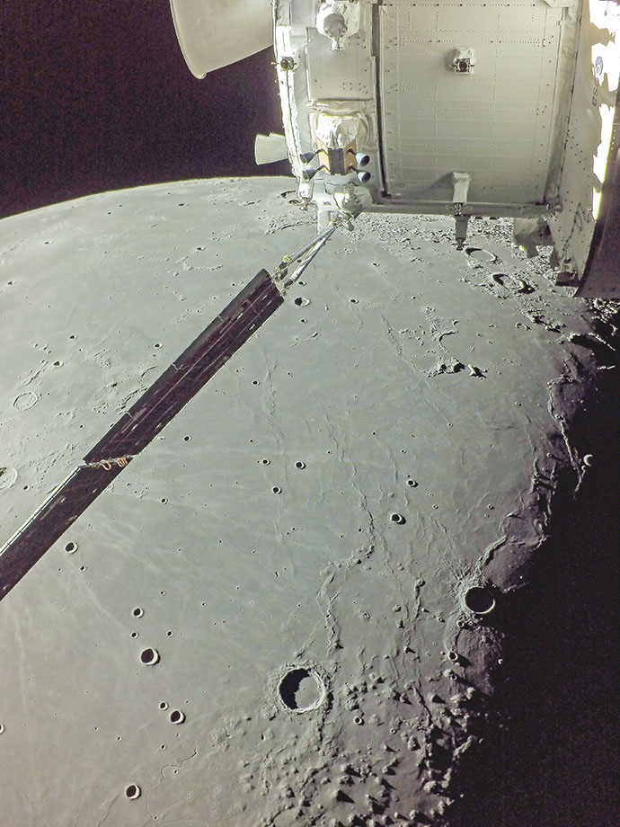 在獵戶座太空船伸展的太陽能板之外,是位於西緣黑暗而平滑的地形。著名的風暴洋位於月球近地側,是月球上最大的一個熔岩淹沒的月海。月球的晨昏線,即月球夜晚與白晝的分界線,沿著畫面的左側延伸。直徑四十一公里的馬呂斯坑位於畫面上方中央,而克卜勒環形山則在太陽能板翼的右側邊緣隱約可見。