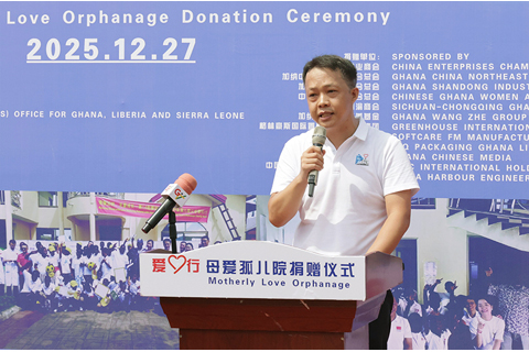 ◎ 加納多家中國商會和中資企業日前向位於加納首都阿克拉的一家收容六十餘名愛滋病病毒感染兒童的孤兒院捐贈了床上用品、洗衣粉、醫療物資及食品物資等。圖為十二月二十七日,在加納首都阿克拉,第十四批中國援加納醫療隊隊長楊永光在捐贈儀式上講話。(新華社記者 高劍飛 攝)