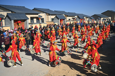 ◎ 十二月二十九日,甘肅省蘭州市榆中縣舉行山洪災害災後重建集中搬遷入住活動,全縣六個集中安置點三百二十五戶受災民眾全部搬進新居。二0二五年八月初,甘肅省蘭州市榆中縣遭遇連續強降雨引發山洪災害,導致部份鄉鎮的房屋、道路等基礎設施嚴重受損。圖為在榆中縣舊莊溝村集中安置點民眾觀看文藝演出。(中新社記者 九美旦增 攝)