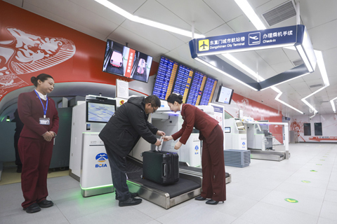 ◎ 十二月二十九日,北京地鐵首都機場線東直門站行李託運服務正式投入運營,該服務將有效分散航站樓值機櫃檯的壓力。自此,前往首都機場T3航站樓乘坐中國國際航空股份有限公司國內航班的旅客,在地鐵東直門站即可提前辦理自助值機與行李託運手續(需預留航班起飛前至少三小時),輕鬆享受「從地鐵直達登機口」的無縫銜接出行體驗。圖為旅客在東直門地鐵站辦理行李託運。(中新社記者 賈天勇 攝)