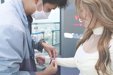 今晚(15日)胡慧冲(Roger)跟「波波」黃婧靈將盡地一煲,在泰國樓高74層的最高建築物天台,體驗名為「I-Tilt」懸浮式觀景台。觀賞的方式令人嘆為觀止,玩家會俯伏在繩網,然後以傾斜65度視角俯瞰整個曼谷市,身體只靠繩網支撐,膽小者肯定嚇到喪膽。二人來到頂層,負責玩的波波由工作人員戴上顯示心跳的手錶,接住躺在繩網上。當機械緩緩落下,波波整個人便向外懸浮半空,離地距離296公尺,單是望已令人腳軟,更莫講整個人爬出建築物外。波波玩不到一分鐘已猛叫救命,事後她說︰「真係幾恐怖,啱啱上去頭10秒,我以為自己就來死,好緊張真係好高。」一旁的Roger發揮幸災落禍本色,笑稱一直觀察波波的心跳正常,所以毫不擔心。接下來二人介紹的是曼谷喜愛夜蒲店,每到周五、六、日門口便會出現長長的排隊人龍,平均要等2小時才可以入場,Roger說︰「餐廳提供西班牙、法國菜同泰菜,當然以飲酒為主,職員仲好投入會表演簡單歌舞,成個場氣氛好高。」一身晚裝的波波玩得非常投入程度,肯定是愛蒲之人。
