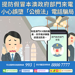 司法警察局近日接獲通報,指有香港市民反映接獲自稱來自本澳不同政府部門(包括旅遊局、教育及青年發展局、個人資料保護局、法務局、勞工事務局、社會保障基金)的「官方電話」。來電者自稱為政府職員,指控事主名下的手機號碼涉嫌發送違法訊息,隨後再有一名自稱澳門「司警」致電事主,並指收到相關政府部門投訴,要求事主配合調查。
