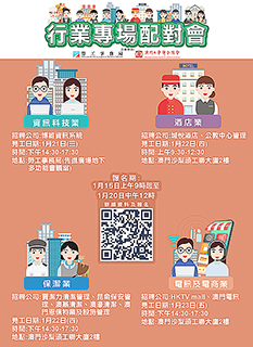 本月23日下午舉辦電訊及電商業專場配對會,參與企業有「科索(港澳)電子商務有限公司(HKTV mall)」及「澳門電訊股份有限公司」,合共提供61個職位空缺,涉及客戶熱線代表、客戶服務中心後勤支援人員、客戶服務主任(門市銷售)及電訊服務技術員。