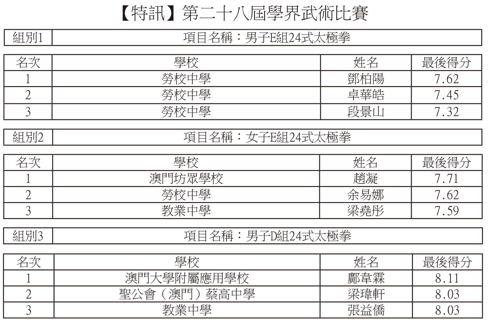 卡域克領軍即贏打吡大戰 曼聯兩球克宿敵曼城 認與中國合作是雙贏 歐塞爾球會為中國青訓 中外龍舟勁旅匯吉林 挑戰「不凍松花江」 三比0擊敗利爾 聖日門重登榜首 愛斯賓奴不敵基羅納 積分榜排名仍居第五 點球四比二擊敗烏茲別克隊 U23亞洲杯中國首進四強 麥巴比與阿辛斯奧助球隊挫利雲特 皇馬一分之差緊追榜首 澳門學界武術比賽開賽 澳門國際瑜伽體式賽收官 逾百選手同台競技 澳洲阿德萊德網球賽 安祖伊佳占魁 澳大利亞網球賽今開打 中國軍團陣容齊整可期 有信心取得其澳網第十一個冠軍 祖高域勢拼第25座大滿貫 以四十五歲高齡出戰澳網女單 大威已作好挑戰準備 夏登發威助快艇逆轉速龍 騎士險勝76人兩分 一月份健康諮詢站 在孫中山公園及二龍喉舉行 澳門學界武術比賽開賽 2026-01-18 03:30:00 【特訊】第二十八屆學術比賽舉行多場賽事,選錄部份成績以窺其全豹。