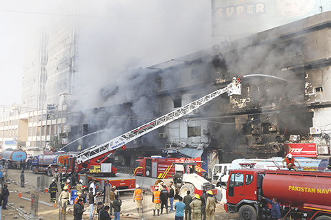 巴基斯坦卡拉奇一家購物中心發生火災 造成至少六人死亡 2026-01-19 03:30:00 ◎ 一月十八日,消防員在巴基斯坦卡拉奇的火災現場滅火。巴基斯坦官員當日說,當地時間一月十七日晚間,巴基斯坦南部信德省首府卡拉奇一家購物中心發生火災,造成至少六人死亡、二十多人受傷。(新華社發)