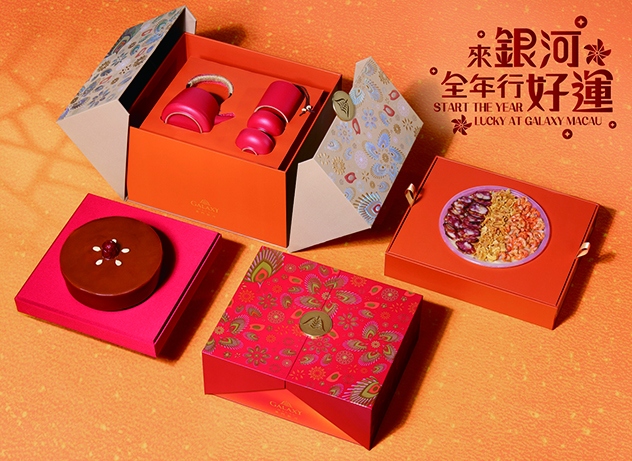 「澳門銀河」的「鴻運黑糖年糕」及「瑤柱珍味蘿蔔糕」,選用上等食材演繹傳統風味,另備附有茗茶及茶具的豪華版禮盒,獨家調配的「花開富貴」茶品,集牡丹、玫瑰、桂花之雅韻,融入醇厚雲南紅茶,補氣養心,搭配糕點享用,寓意鴻運高升、大富大貴。而位於「澳門銀河」的麗軒及名廚都匯亦分別呈獻「絢麗豐年」矜貴年糕禮盒及「萬豪新春賀年禮盒」。