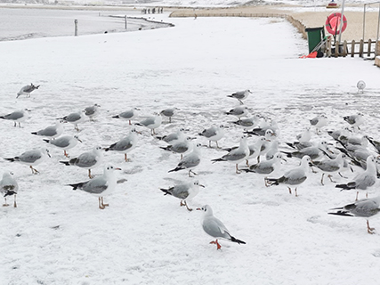 那天青海省忽然降雪降溫,令團隊遊興大減,但既然已經來到了景區,旅客們也只好冒著雨雪下車拍照,在青海湖邊築有亭台、祈福的佛塔及經幡,雖然遍地積雪,但岸邊還是有不少水鳥聚集;附近也有敖包,惟因天氣關係,只作短暫停留,未作深度遊。之後被安排到一家藏族民宿裡吃午餐,由於接下來沒有行程,加上天氣又冷,大家就在民宿裡到處閒逛,看看他們的地道商品,後來還在民宿裡飲下午茶,品嚐他們的地道美食,期間店主還為大家安排了藏族舞蹈表演。