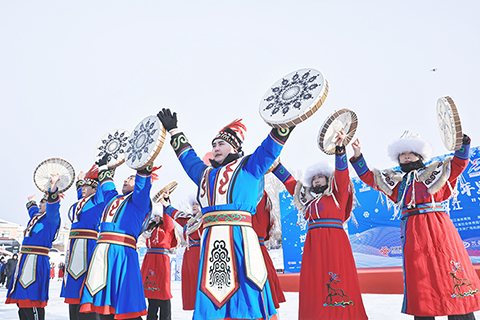 ◎ 一月廿三日,赫哲族群眾在街津口赫哲族鄉冬捕活動現場進行民俗表演。當日,作為黑龍江省「冷水魚.冬捕季」分會場之一,黑龍江省同江市在街津口赫哲族鄉修恩湖畔舉行冬捕活動。本次活動融合民族漁獵、民俗體育等內容,讓人們沉浸式領略冰雪盛景,感受赫哲民俗文化魅力。(新華社發 劉萬平 攝)