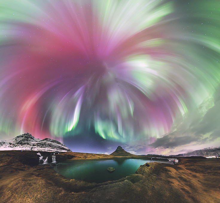 令人嘆為觀止的極光冕如同從頭頂傾瀉而下的能量光幕,是在二零二五年三月春分前後,由強烈的太陽活動引發的強烈地磁暴期間觀測到的。這張展現北方大地和天空的全景馬賽克照片,以二十幀畫面捕捉了這令人難忘的景象。◇