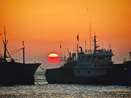 日影西斜,抵鵝尾沙灘,天邊雲霞由金轉橙紅,海浪鍍上粼粼金光,一波波湧向腳畔。遠處船艇靜泊,似閒看岸上人們追逐夕陽。落日沒入海平線,天空與沙灘浸染在暖調餘暉中。