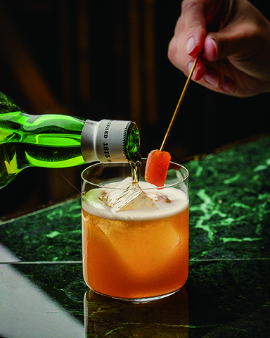 Basil Smash(羅勒派對)——這杯生機盎然的綠色「Daisy」雞尾酒,靈感來自Mark鍾愛的米蘭Moebius酒吧,以帕瑪森杜松子酒與青醬的鹹香交織,帶來耳目一新的清新口感。