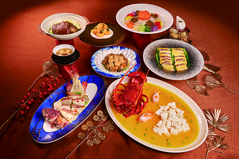 節慶菜單以寓意吉祥的新春撈起三文魚為亮點,融合三文魚、金黃薄脆和蔬菜絲,可親手「撈起」為新年掀起好運。菜單包括新加坡黑胡椒蟹、發財蠔豉大利及新春鴻運當頭烤乳豬。為增添歐陸風味體驗,餐廳特別設有廚師即席主理的現切伊比利亞5J火腿,甜品專區品嚐主題甜點,為這頓豐盛團圓聚餐畫上圓滿句號。