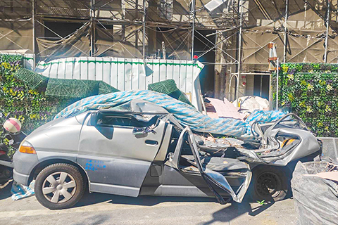 台肇高空砸物工業意外 2026-01-29 03:30:00 ◎ 一月二十八日上午,台灣彰化縣溪湖鎮光平街一處興建中的大樓工地,一輛動力機械吊車在吊掛隔間板材時,板材從十一樓掉落,砸到一輛附近居民的小客車和一輛建設公司車輛,幸好當時車內無人,未有人員受傷。(香港中通社圖片)