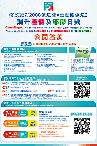 【特訊】特區政府昨(31)日起至3月16日期間,就修改第7/2008號法律《勞動關係法》規定的產假及年假日數展開為期45日的公開諮詢。諮詢文本建議產假調升至90日,年假則建議按年資遞增,每滿2年年假日數增加1個工作日,最多增至12個工作日,以持續優化勞動權益保障,讓僱員更好地平衡工作與家庭生活。特區政府期望透過公開諮詢的方式集思廣益,聽取社會各界對於修法內容的意見和建議。