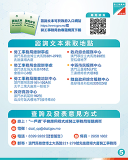 公眾可於政府入口網站(https://www.gov.mo)及勞工事務局的專題網頁(https://www3.dsal.gov.mo/survey/labourlaw/)查閱及下載電子版的諮詢文本。實體的諮詢文本亦可在勞工局總辦事處、金龍辦事處、職業培訓中心,以及政府資訊中心、政府綜合服務中心、中區市民服務中心、離島政府綜合服務中心索取。