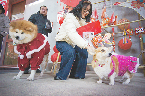 ◎ 二月一日,天津舉辦寵物年貨節吸引眾多市民攜愛寵參與。活動現場設置寵物年夜飯試吃、新年打卡拍照、免費領取寵物圍巾等環節,匯集了京津冀多家寵物文創品牌,涵蓋零食、新春服裝、玩具、飾品等全品類寵物用品。圖為市民與兩隻身穿新春服裝的寵物互動。(中新社記者 佟郁 攝)