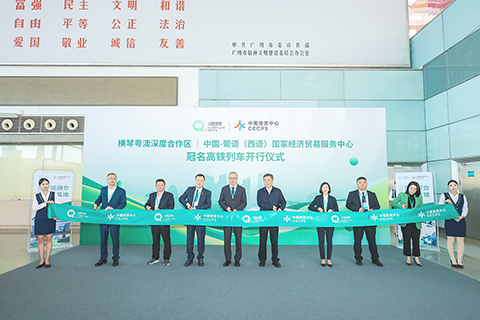 首發儀式上,橫琴合作區執行委員會副主任、中葡經貿中心理事會理事長曹晉鋒,中國鐵路廣州局集團有限公司黨委書記、董事長蔣輝,橫琴合作區行政事務局局長鍾頴儀,財政局局長王晨輝,城市規劃和建設局副局長史忠峰,法律事務局副局長、中葡經貿中心理事會副理事長吳燕翔,中金資本運營有限公司董事總經理、中葡經貿中心運營管理有限公司董事許中超,華鐵傳媒集團有限公司創始人、董事長路立明共同為高鐵列車開行揭幕。