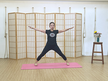 接著張開雙手,兩臂延展,雙腳跳開大概三尺半,手肘伸直,平舉至水平線,保持拓展胸腔,和增加腹部空間。然後將兩邊髖關節釋放,腹股溝下沉,找回坐骨的位置,令坐骨朝地面,尾骨向內收。