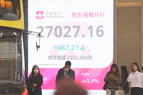 【香港中通社2月9日電】(記者張明臻)內地股市及外圍股市皆造好,港股9日高開高走,恒指收報27027點,升467點或1.76%,大市全日成交2551億港元。