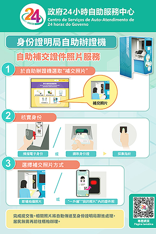 為簡化居民補交證件照片的手續,即日起,收到補交照片通知的澳門特區居民身份證、澳門特區旅行證件及往港旅遊證的申請人,可前往澳門8個政府24小時自助服務中心,以及橫琴政務服務中心24小時自助服務區和「澳門新街坊」澳門政務24小時自助服務中心,使用澳門政府的自助辦證機完成補交手續。申請人只需選擇「補交相片」服務項,透過實體身份證或電子身份,以及指紋核實身份後,便可選擇使用在自助辦證機即場拍攝的照片,或「一戶通」「我的照片」內的證件照作為補交照片。完成提交後,相關照片將自動傳送至身份證明局跟進處理,居民無需再前往櫃枱辦理。