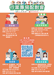 本月二十四日全日酒店業專場配對會在澳門新濠影匯三樓宴會廳一至五舉行;二月二十六日下午超市零售業專場配對會在澳門關閘馬路一0一至一0五A號太平工業大廈第一期一樓工聯職業技能培訓中心舉行;本月二十七日上午保潔業專場配對