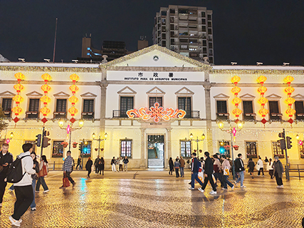 澳門迎接馬年的來臨,政府在各區擺放大型燈飾與花藝展,在中區的議事亭前地的燈飾是駿馬踏祥雲,寓意馬年充滿活力,馬具克服困難與飛躍的意象。在美麗活躍的大型燈飾,並配上嬌美的年花,傳遞新春的祝福。