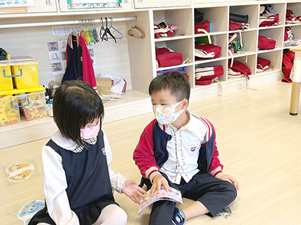 除了主題課程之外,在今日的Reading課程中,孩子練習用英文來說故事;我們讓小孩兩兩一組,分別唸故事給對方聽,從中培養孩子合作以及其語文發展。