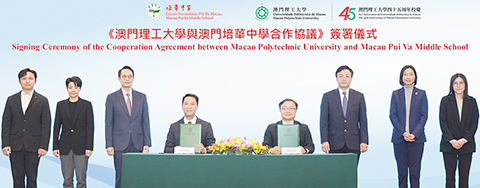在澳理大校長嚴肇基、副校長李雁蓮、校務研究及協調部代部長李荔祺、培華中學校董會副主席李俊鳴、校監許樂敏,以及校監劉智龍的見證下,澳理大應用科學學院院長林燦堂與培華中學校長李秋林簽署《澳門理工大學與澳門培華中學合作協議》,標誌著兩校的人工智能教育合作正式啟動。