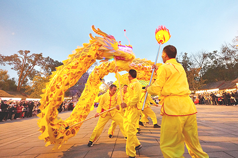 ◎ 2月13日,大廟會上的舞龍表演。當日,2026武侯祠成都大廟會在四川成都武侯祠博物館拉開帷幕,大廟會以「燈組、展覽、演出、集市、活動、數字化體驗」多種形式,將三國歷史文脈、非遺匠心技藝與前沿數字科技融合。(中新社記者 安源 攝)