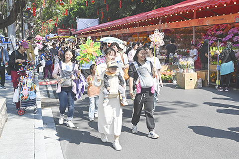 ◎ 二月十四日,二零二六年廣州海珠濱江花市開始迎客,吸引市民前來「行花街」迎接馬年春節。行花街,即逛迎春花市,是廣府地區春節前夕規模較大的一項辭舊迎新、祈福賀歲活動,融合了年俗、花卉與商貿文化。二零二一年,春節(行花街)被列入國家級非物質文化遺產代表性項目名錄。圖為市民手持風車逛花市。(中新社記者 陳驥旻 攝)