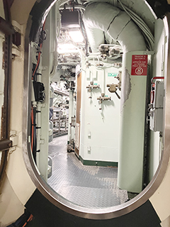 從艇頭進入,先是佈滿儀表,按鈕,綫路管導,及燈號的中央控制室,繼而沿着僅容一個人的曲折通道,依次參觀了電訊室,電報室,工具擺放室,魚雷彈藥儲存庫。所有空間極為擠逼,位盡其用。