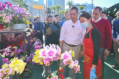 陳茂波表示,今年以來,訪港旅客數字持續增加,從一月一日到二月十三日訪港旅客人次達七百二十三萬,比去年同期增加百分之九點六,海外旅客更顯著增加百分之十六點四。香港十四個年宵市場各具特色。其中,維多利亞公園花市過去多年都是香港規模最大的年宵市場,氣氛熱鬧。與一些年宵攤檔商戶聊天時,大家都說今年氣氛好,多個由大學生和中學生承投的攤位創作了多款以馬年為主題的產品及賀年潮語,應節又有趣。