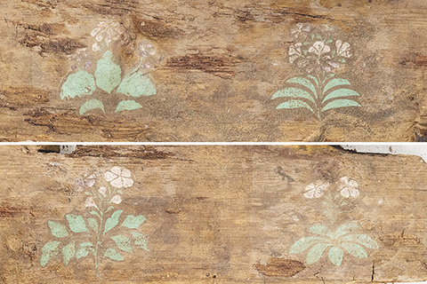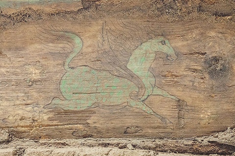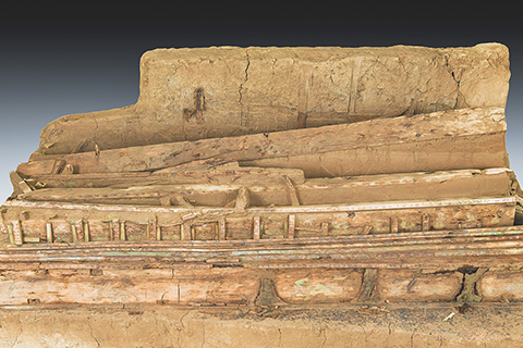 ◎ 這是在實驗室考古方艙內拍攝的墓葬M20出土的木棺座壼門內的彩繪「瑞獸」圖案(二月一日攝)。(新華社記者李賀 攝)