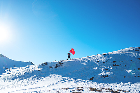 冬日時節,西藏山南市隆子縣玉麥鄉的群山覆蓋著積雪。四名護邊員晨光中行進在雪山間,五十歲的普布羅布肩扛國旗,走在隊伍最前面,索朗多吉、拉巴次仁、洛桑羅布緊跟其後。