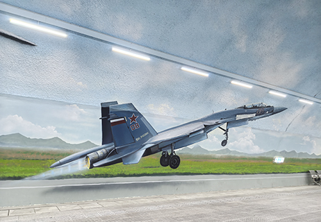 人行道兩側繪上澳門風景,如世遺建築物、跨海大橋等,吸引我的是有戰機和民航客機。
