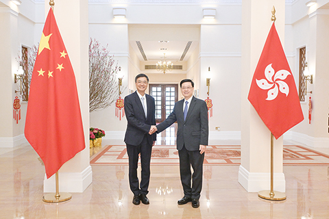 香港新一份財政預算案財赤止血派糖惠民且加甜 今財年度任務造血押注AI投資未來 李家超禮賓府與廣西壯族自治區黨委書記陳剛會面 李家超:預算案創新務實惠民生 港政商界認同預算案舉措 匯控查佈業績後股價漲逾百分五 港股升一七五點 香港今年一月份通脹率 放緩至百分一點一 女警在警署疑自轟亡 經營賬目提前恢復盈餘惟仍發債投資基建 陳茂波料今年經濟增長百分二點五至三點五 港推出百億創科基金 培育新興產業 將投放卅億元 推動文旅產業發展 煽惑他人在立法會選舉不投票 港女子認罪判囚緩刑 李家超禮賓府與廣西壯族自治區黨委書記陳剛會面 2026-02-26 03:30:00 ◎ 二月廿五日,香港特區行政長官李家超(右)在禮賓府與廣西壯族自治區黨委書記陳剛(左)會面。(香港中通社圖片)
