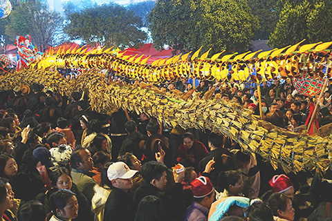 【中新社貴州施秉二月二十六日電】(中新社記者 周燕玲 楊茜)二月二十五日,中國農曆正月初九晚,貴州省施秉縣主大街兩側擠滿了人,三十六輛特色花車、二十多條龍燈蜿蜒穿行,有人踮起腳尖,有人把孩子舉過頭頂,觀看這場一年一度的龍燈巡遊展演。