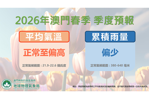 【特訊】地球物理氣象局綜合最新預報資料,預測2026年本澳春季(3月至5月)的平均氣溫將屬於正常至偏高;而降雨方面,預測整季累積雨量將屬於偏少。