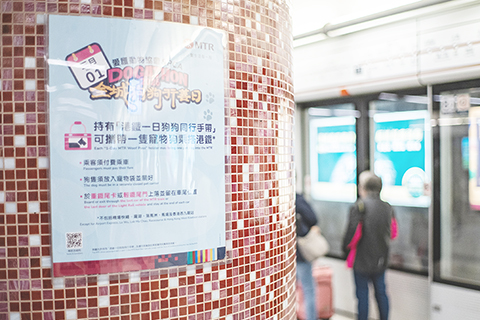 ◎ 三月一日,香港鐵路有限公司首次推出「一日狗狗同行」活動,在滿足提前申請、搭乘最後一節車廂、將寵物狗裝入寵物袋的條件下,市民可攜帶一隻寵物狗乘坐大部份港鐵線路的列車。圖為港鐵車站月台張貼有「一日狗狗同行」活動的海報。(中新社記者侯宇 攝)