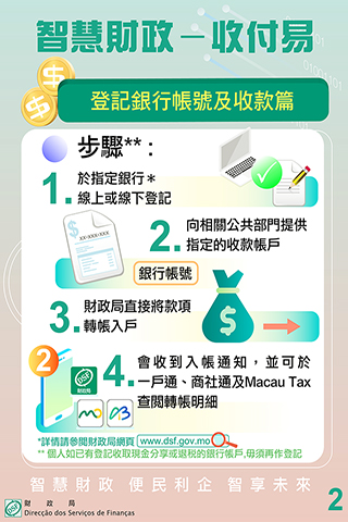 配合電子政務發展,「智慧財政‧收付易」構建了全流程線上化的政府款項收付系統,雙向優化收款與繳款兩大環節。二0二六年三月起,財政局將以自動轉賬方式,將貨款、工程款項、保證金(退還)、服務費等各類款項直接存入已登記的指定銀行帳戶。收款人毋須持單到銀行兌現,縮減資金到帳時間。轉賬完成後,系統會自動發出入帳通知;收款人可透過「一戶通」、「商社通」及「MacauTax」平台查閱轉賬明細。