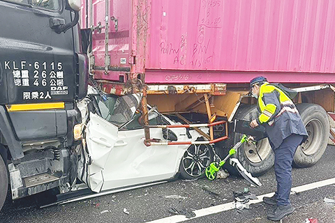 兩岸同胞在閩共度元宵節 台灣第一高速公路發生死亡車禍 一輛貨櫃車追撞一輛自小客車 台灣腎病照護年碳排達百萬噸 相當環球航行一千七百趟 大陸花燈跨越海峽 亮相台灣各地燈會 台灣第一高速公路發生死亡車禍 一輛貨櫃車追撞一輛自小客車 2026-03-04 03:30:00 ◎ 三月三日台灣第一高速公路高雄路竹路段發生一起死亡車禍,一輛貨櫃車追撞一輛自小客車,自小客車再推撞前方貨櫃車,造成自小客車被兩輛貨櫃車夾擊,駕駛郭姓男子被救出送醫急救不治。(香港中通社圖片)