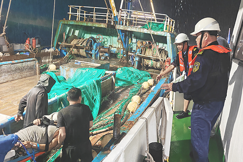 接到險情報告後,珠海市海上搜救中心立即啟動應急預案,就近調派珠海海事局九洲港海事處「海巡0九三三」、海洋綜合執法部門「中國漁政四四一七四」等船艇趕赴現場開展救援。當時現場遭遇強雷雨天氣,海況惡劣,救援難度陡增。海事人員持續通過電話、甚高頻、智慧海事監管系統等多管道,精準鎖定漁船位置,即時與船方保持溝通,動態掌握傷患狀況,並快速制定科學接救方案。海巡船與漁政船協同配合,前往現場護航漁船進港,二十二時十分,在大萬山碼頭成功將傷患轉運至「海巡0九三三」船。同時,搜救中心同步協調一二0急救中心,安排救護車及醫護人員在香洲港公務碼頭提前待命,確保漁船靠岸後傷患能實現「零延誤」送醫。
