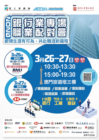 【特訊】為配合特區政府落實推動經濟適度多元,提升本地人才競爭力,並為本澳居民提供就業配對機會,由勞工事務局(下稱「勞工局」)和澳門銀行公會合辦、澳門工會聯合總會承辦的「二0二六年銀行業專場職業配對會」,將於本月二十六日至二十七日一連兩日假澳門旅遊塔會展娛樂中心三樓展覽廳舉行。有意參加的本澳居民可於三月九日起至三月二十四日期間登入勞工局活動專頁網上預約。